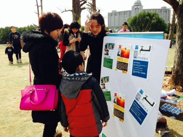 为了吸引更多的人来关注本次活动,有两个干事发传单向大家介绍活动,并且有人穿上熊猫装与大家互动,吸引了很多小孩子绕在他身边,扩大了宣传的范围。在互动环节考虑到会有很多的小朋友来参与这次活动,社团组织设置了三个小游戏。第一个游戏是小朋友们向篮筐中投掷网球,这样可以锻炼小朋友们的手眼协调能力。之后这个游戏又改成了小朋友们向篮子中运球,比谁运的快,小朋友们得到了很多体力锻炼,越来越多的小朋友们来参加,整个场地都可以听见小朋友的欢声笑语。第二个是问答游戏,题目是一些简单的有关环保的问题,并且向他们介绍关于垃圾分类,空气污染和节约用水等一些常识,比如说塑料、玻璃是不是可回收垃圾;空气污染都有哪些来源;生活中怎样节约用水等。本来以为小孩子可能会因为年龄小,生活经验少而对这方面了解的匮乏,答不出这些问题,但是其中有些人还是可以很好地答出这些问题,原来是上课的时候老师也会为他们讲一些关于环保的问题。他们在小小年纪就已经开始关注环保,随着环保宣传的普及,越来越多的人关注绿色环保,相信环境问题可以得到更好的解决。当然也有很多小朋友不知道这些知识,在部员们的耐心讲解下,他们也对环保有了更多的认识,并且承诺以后会节约用水,保护环境。干事们都感到很高兴,越来越多的人为环保努力尽自己的一份力。最后一个是考验小朋友们动手能力的游戏:植物种植。在干事们和家长的帮助下,小朋友们完成了人生第一次绿色植物的种植,大家都感到很兴奋。此外,干事们还现场向大家展示了水的过滤,小朋友们看着污浊的水慢慢变成了清澈的水,都感到很好奇。干事们向他们介绍了净化的原理,小朋友们听了之后有所感悟,同时也表现出对科学知识的无限好奇。之后干事们到河边检测了中央公园附近河流的水质,上游和下游的水都符合标准,并没有超标现象。十二点,干事们清理了场地周围的垃圾,结束了此次活动。