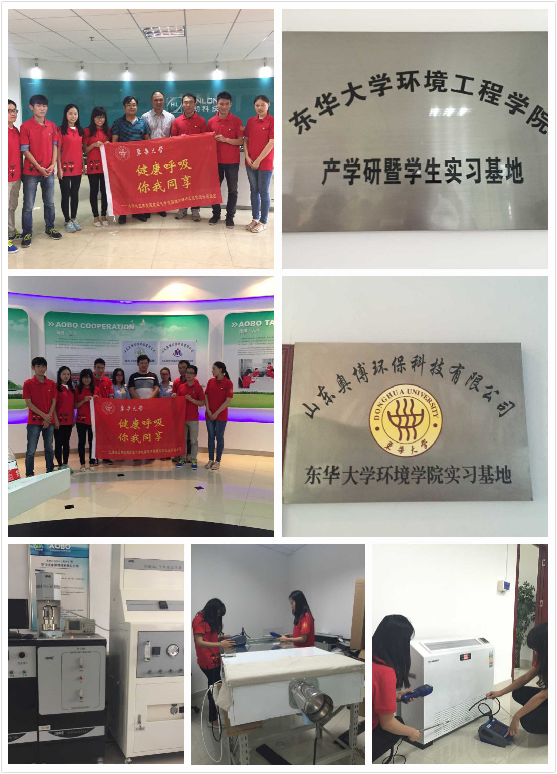 为保证实践的科学性与严谨性,实践团队极为重视参观与交流学习的机会。团队首先来到江苏恒朗科技有限公司,与企业技术人员进行交流,了解玻纤、驻极体等过滤材料,探讨空气净化器的相关问题,并在测试间用香烟发尘,待气流组织和浓度稳定后用仪器记录PM2.5初始浓度,并开启空气净化器,对PM2.5浓度进行监测分析,了解净化过程的变化情况及净化实际效果;其次,实践团队一行来到山东德州奥博环保科技有限公司,在郑经理的带领下,参观了公司的产品展厅、生产车间及研发中心,通过交流学习,对公司生产的产品、过滤材料以及实验设备等有了直观和进一步的了解,尤其是对新型过滤材料的性能认识更加胸有成竹。