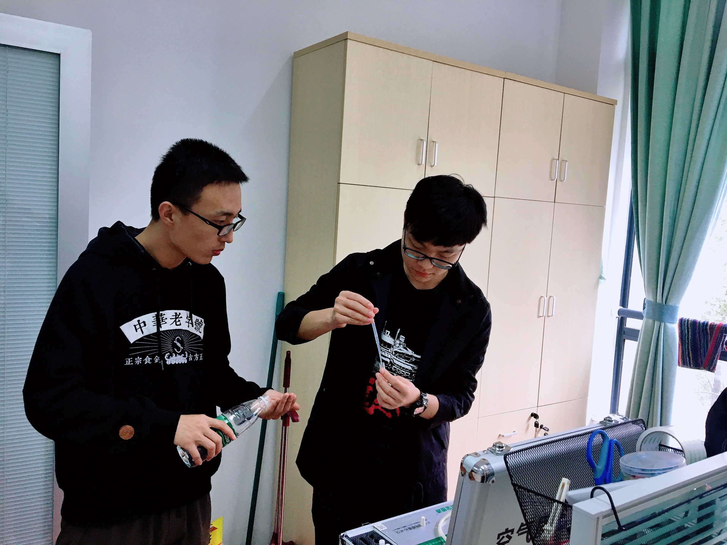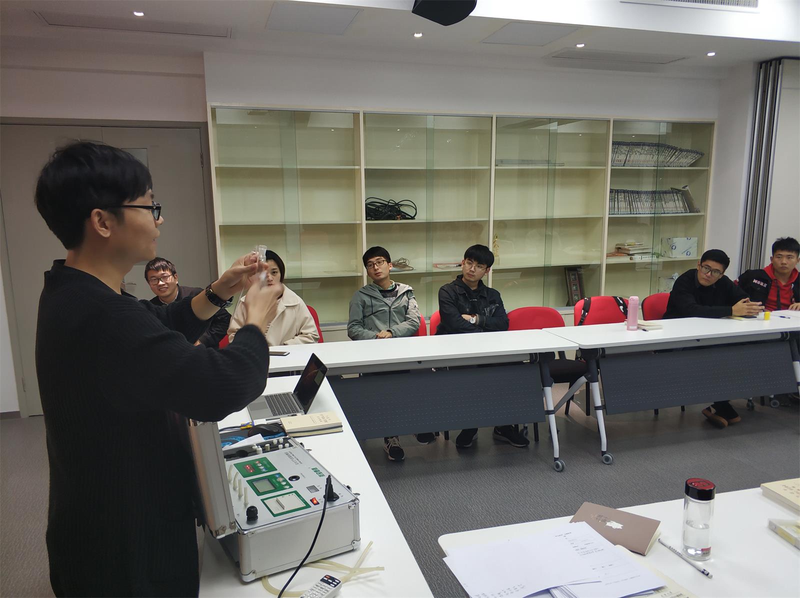 11月14日晚,支部党员齐聚公司楼3150进行操作培训。会前,支部书记章基法介绍活动背景及目的,希望党员同志以此次志愿活动为契机,强化服务人民理念,更好的发挥研究生党员先锋模范作用。随后,钱天威详细介绍了检测仪器的使用,逐一检验每位党员的实际操作情况,并对大家进行分组,明确要求。整个活动分两大组,女生测宿舍,男生检测公司楼。