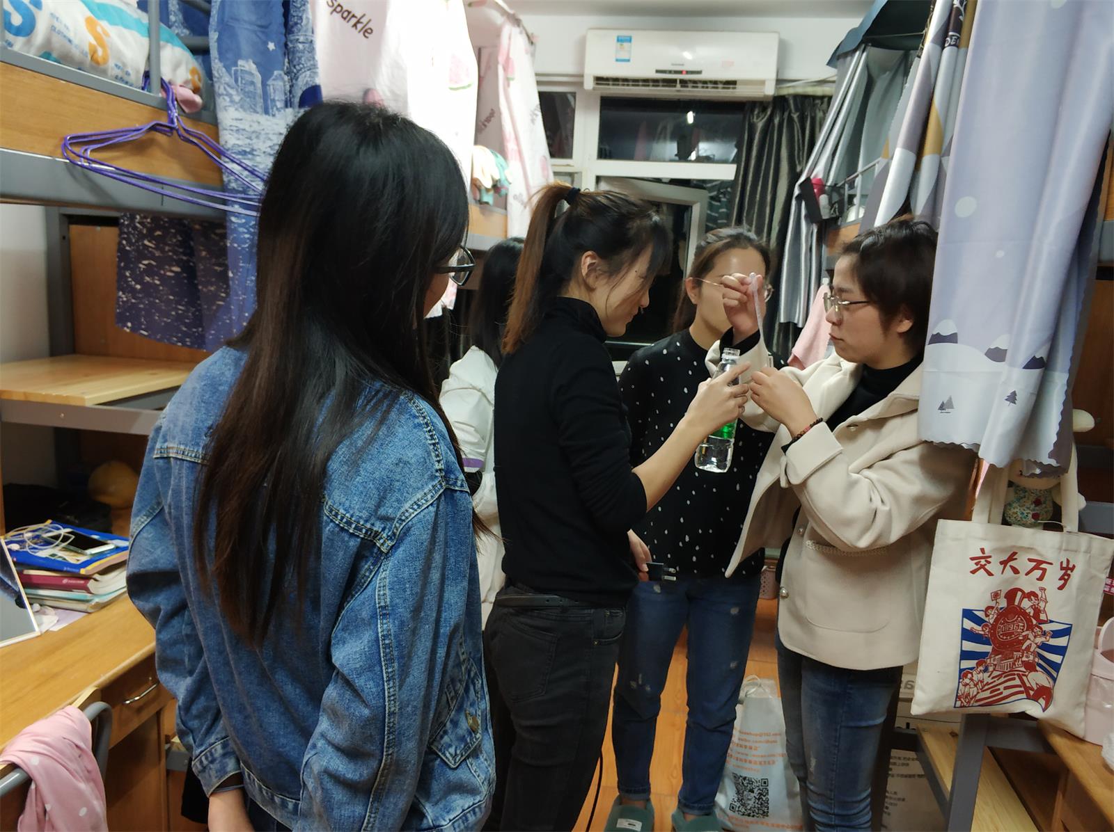 11月16日晚,巫秀玲等一行党员携带室内空气质量检测仪走进九号宿舍楼的308寝室。洪萍按照要求将设备组装完成,调试好参数及试剂,然后开始对寝室采样,在等待结果的同时,邹雅倩向寝室里的同学们普及了甲醛的危害以及减少甲醛的方法。半小时后洪萍将甲醛检验合格的结果告知了所在寝室,陈灼表示这次的测量甲醛活动让她更安心的住在寝室,并对测试人员表示感谢。随后,支部党员还分别对304、315、317、319寝室的甲醛浓度进行了测量,结果显示大多数寝室的甲醛含量没有超过规定最大值,个别寝室存在甲醛浓度超标。针对超标情况,陈露露建议寝室保持开窗通风,及时稀释甲醛;或者买些小盆栽放在寝室,吸收甲醛。