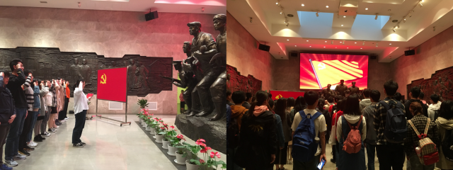 随后所有人来到中共四大纪念馆,参观学习中共四大的历史背景和历史意义。中共四大是中国共产党历史上一次具有重大意义的代表大会,大会第一次提出了无产阶级在民主革命运动中的领导权问题,确立了加强党的领导、扩大党的组织、执行使党群众化的组织路线。在中共四大纪念馆中,环境公司员工党支部的39名正式党员与预备党员庄严宣誓,重温入党誓词,表达了对党的忠诚和为共产主义奋斗终身的坚定决心。环境公司入党积极分子观看了本次入党宣誓仪式,党员掷地有声的誓言激励着每一位同学努力学习、积极进取,更加坚定了他们加入党组织的信念。