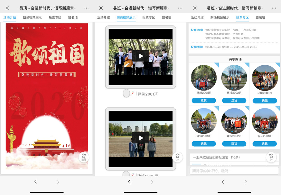 环境公司易班发展中心采用线上推送的方式作为宣传,六个班级积极准备,将自己最饱满的一面展示给同学,展示给祖国。在各班积极筹备与投票评选的过程中,既增强了班级凝聚力与团队合作能力,又激发了每位同学的爱国拥党热情,而在践行社会主义价值观的同时,也提升了易班平台在师生群体中的应用与认可。