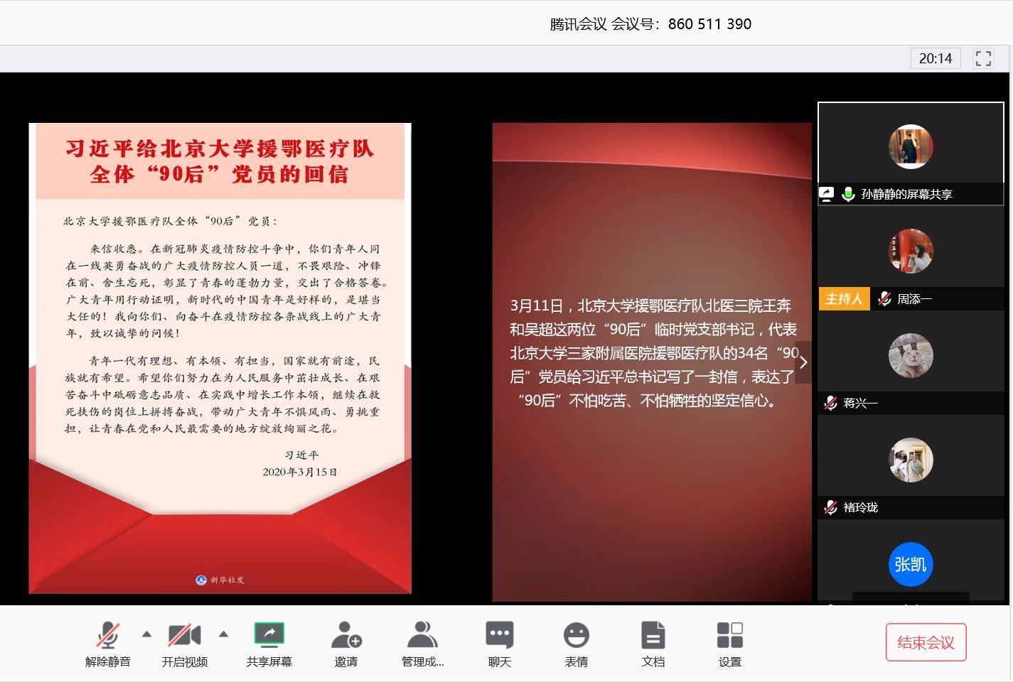 随后,孙静静同志带领大家学习习近平主席给北京大学援鄂医疗队全体“90”后党员的回信,并且观看纪录片《钟南山》。