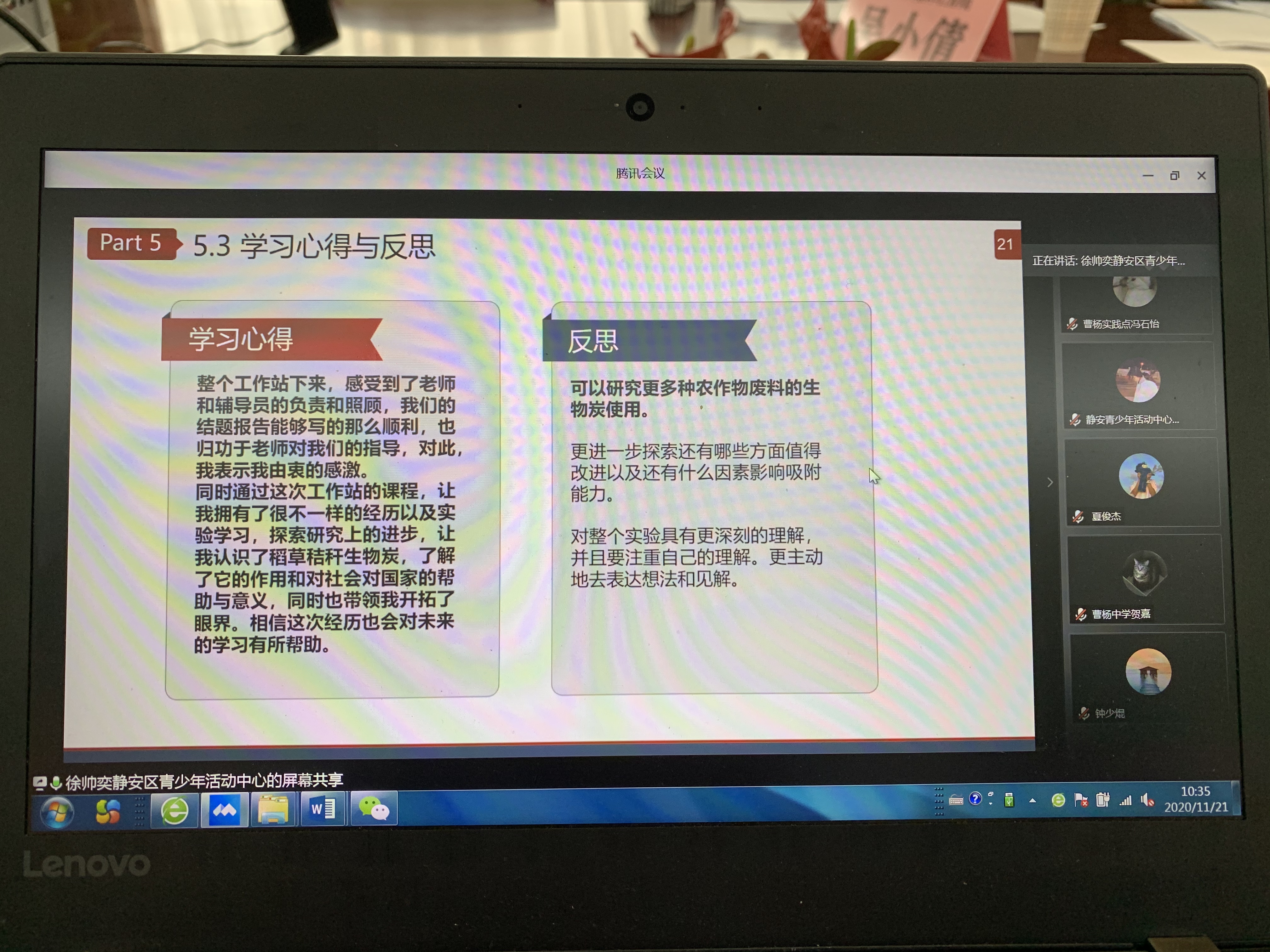 2020年度入站员工共计85人,今年7月员工正式进站,工作站遵循青少年成长需求、认知特点和创新实践教育规律,安排了科研方法、实验室安全、仪器认知等公共课程的学习。员工7至11人进入同一课题组进行研究,在每一个课题中3至4人为一研究小组,围绕环境相关的10个课题开展研究和探索,并及时进行开题指导、中期检查、结题答辩。由于疫情防控的原因,原定的后期线下进校实验取消,但这并未影响到员工对科研的热情以及工作站实验与教学工作的正常推进。为了让员工能更好地感受和体验实验过程,更能了解课题的内容,指导老师将线下实验改为线上实验录播视频演示,同样也别具特色。为保证育人质量,指导教师积极组织员工定期分享、辩论、反思与汇报,注重员工创新实践的过程培养,让员工受益匪浅。
