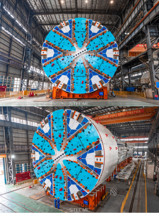 随后在装备车间,参观了服务于上海轨道交通市域线机场联络线工程的“骐跃号”盾构二号机。该盾构是首台具有完全自主知识产权的超大直径泥水气平衡盾构。该盾构刀盘切削直径14.05m,整机总重约3200t,整机长度99m,设计掘进速度60mm/min,最小转弯半径520m,适用于隧道坡度6%的掘进施工中。其具有满足长距离超埋深掘进施工中的常压换刀技术,200多把组合刀具实现100%全断面切削,还具有驱动系统高压密封技术、推进系统可重构分区液压控制技术、多手段地面沉降控制技术和辅助系统无轨式车架技术。高精度控制可减少土体扰动,适应于复杂施工工况。该盾构将承担区间隧道掘进任务,面临超长距离、大埋深、复杂地层等施工挑战。