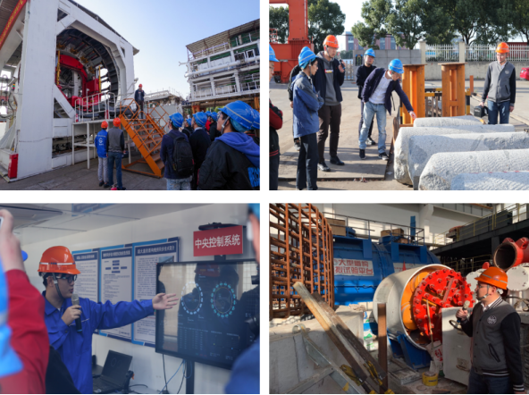 本次参观分为三部分:盾构展厅、装备车间和掘进试验室。首先在盾构展厅,工作人员详细介绍了机械制造分公司的历史沿革,包括早期应用于上海打浦路越江隧道的网格式盾构、国内首次研制的土压平衡盾构、双刀盘可更换驱动复合式盾构以及应用于上海地铁14号线静安寺车站建设的矩形顶管机。