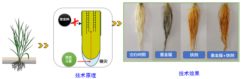 技术原理:利用改性天然铁矿物诱导水稻根表生成胶膜,可在保证水稻根系有效吸收营养元素的同时抑制其对重 金属的吸收,可降低铜累积量70%以上。