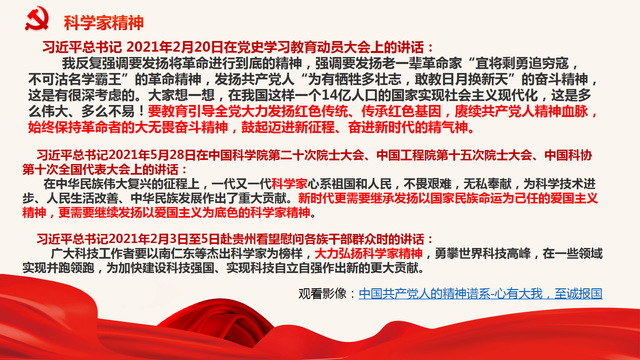 围绕习近平总书记系列重要讲话中伟大建党精神的有关内容,支部书记苏亚欣同志进行细致、系统地梳理并制作了精美的PPT课件,以科学家精神为重点,通过引用相关党史史料、CCTV1《新闻联播》节目和新华社播放的有关新闻片,组织党员一起认真地学习了中国共产党人的精神谱系、科学家精神的构成要素和本质特征。