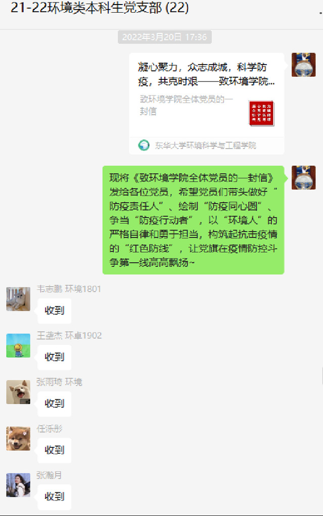 战“疫”有我,使命光荣。环境类本科生党支部将继续做好疫情防控的“急先锋”、“引导员”、“排头兵”和“保护者”,用实际行动为疫情防控狙击战贡献自身力量。疫情尚未结束,但终将结束,环境类本科生党支部一直在路上!