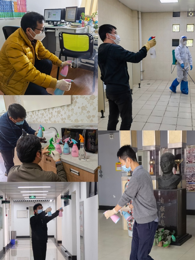 (环境公司驻校教师手持喷瓶,有条不紊地对公司相关场所进行全方位消杀)