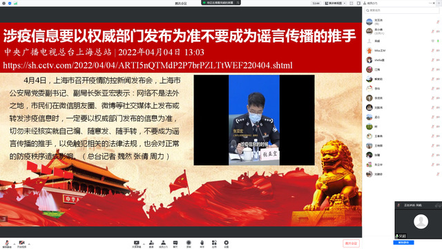 为进一步加强疫情期间师德师风建设,统一思想行动,支部纪检委员吴超同志带领大家回顾了上海市公安局和网信办关于发布涉疫信息的提示,并通过近期若干警示案例,指出网络不是法外之地,教职工应尚德修身不制造谣言、尚学明辨不轻信谣言、尚行守正不传播谣言,要坚定政治立场、增强政治鉴别力、带头发出正义声音、自觉维护良好舆论环境。