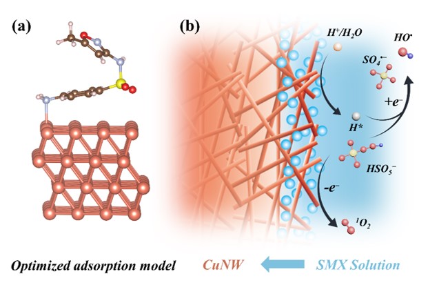 针对以上问题,刘艳彪教授团队研发了一种选择性去除水中含氮污染物的流体电化学系统。该团队设计制备了兼具高导电性和多孔性的铜纳米线(CuNW)材料,可同时作为催化剂、膜电极和过滤介质使用。在辅助电场作用下,暴露的Cu{111}晶面可靶向诱导原子氢(H*)生成,进而促使PMS过氧键裂解为自由基(如HO•和SO4•−)。同时,在含氮污染物(如磺胺甲恶唑,SMX)的参与下,SMX分子的含N基团和Cu位点间相互作用原位形成Cu−N键,有效降低了Cu位点处的电子密度。活性Cu位点处电荷的变化使其更容易从PMS处提取电子,进而加速PMS的氧化进程。该技术具有良好的操作稳定性,对系列含氮污染物均具有优异的选择性降解性能。