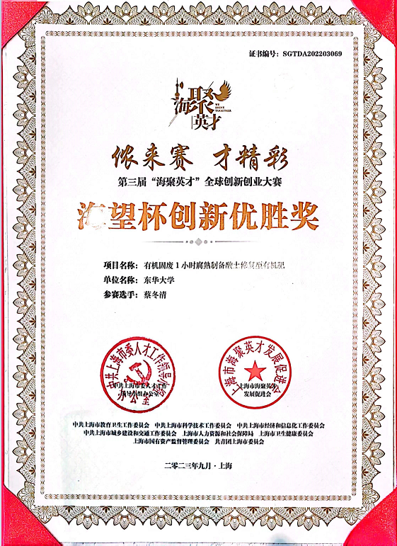 2023年9月20日,上海市“海聚英才”全球创新创业峰会在上海国际会议中心举行,公司蔡冬清团队原创科技成果“有机固废1小时腐熟制备酸土修复型有机肥”荣获优胜奖。上海市市委书记陈吉宁、市长龚正出席颁奖典礼。