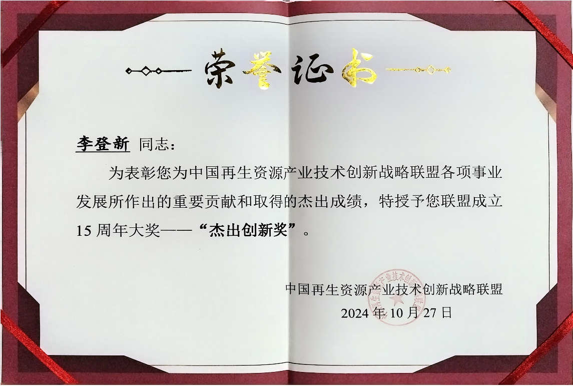 公司李登新教授荣获中国再生资源产业技术创新战略联盟成立15周年大奖“杰出创新奖”