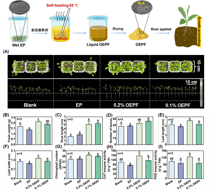 研究团队研发出新型腐熟剂,在常温常压下1小时内完成浒苔的快速腐殖化,成功制备类黄腐酸肥(OEPF)。该技术的关键在于:利用自由基促使浒苔中的多糖、蛋白质等有机物发生降解-聚合反应,形成具有高生物活性的类黄腐酸。盆栽和田间试验表明,该肥料可显著促进植物生长和根系发育。与传统的海藻堆肥和矿源黄腐酸肥料相比,该技术的生产成本更低,具有显著的节能和环保优势,为浒苔的高效回收利用提供了绿色、低成本的解决方案。