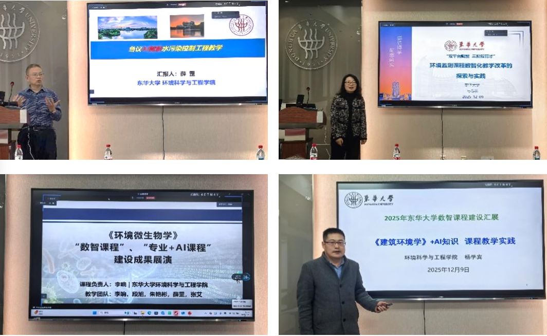 本次展演邀请薛罡、马春燕、李响、杨学宾四位教师别围绕《水污染控制工程(下)》《环境监测》《环境微生物学》《建筑环境学》四门一流课程,展示了各自在AI技术深度融合、教学流程优化及教学模式创新等方面的探索与实践。四位教师的分享内容详实、各具特色。薛罡教授聚焦AI赋能水污染控制工程教学,深入剖析了课程教学中的关键问题,系统梳理了AI在课程中的具体应用场景。马春燕副教授分享了《环境监测》课程的数智化教学改革实践,通过构建知识图谱、建立产教融合数据库等方式,推动教学实现从“经验驱动”向“数据驱动”的转型。李响教授展示了《环境微生物学》课程的线上资源知识库建设成果,通过精心设计创新课题,并依托AI技术高效处理真实项目案例,促进理论与实践深度融合。杨学宾副教授阐述了智能化管理融入建筑工程领域的必要性,分析了AI在数据获取处理与工程科学判断中的赋能价值,并结合实际教学中的AI互动案例,着力培养员工的创新思维。
