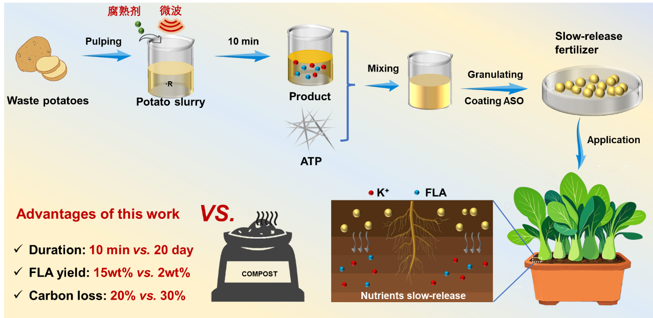 304永利集团蔡冬清研究员团队在餐厨垃圾快速腐熟领域取得重要研究进展,相关成果发表于国际期刊《自然•通讯》(Nature Communications, 2026, https://doi.org/10.1038/s41467-026-68295-6)。304永利集团朱延平副教授为论文第一作者,304永利集团为第一通讯单位。研究团队在原创的有机固废1小时腐熟技术(一代技术)基础上,研发出微波强化餐厨垃圾分钟级腐熟技术,其关键在于:利用微波强化促产自由基,诱导餐厨垃圾中的多糖、蛋白质等易腐有机物发生降解-聚合反应,在10分钟内转化成高活性类黄腐酸,并可进一步制成黄腐酸钾型纳米缓释肥。重要的是,该工艺较第一代技术腐熟剂用量可节省75%,成本降低50%,效率提高6倍。盆栽和田间试验表明,该肥料可显著促进植物生长和根系发育,同步改良土壤微生态。与传统的餐厨垃圾堆肥相比,该技术兼具成本低、肥效高和碳排低等优势,为餐厨垃圾高效肥料化提供了有效新质生产力。